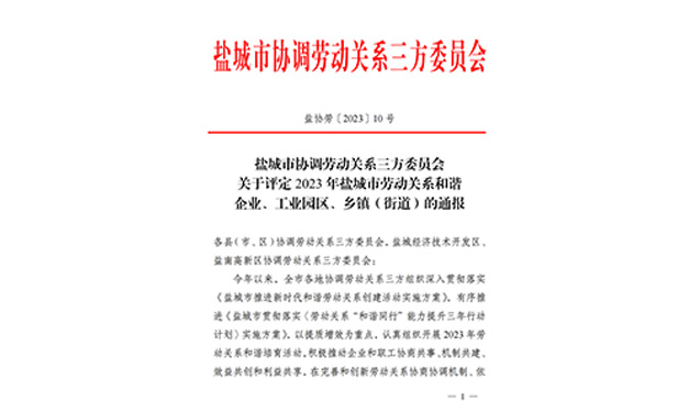 近日,鹽城市協(xié)調(diào)勞動關(guān)系三方委員會按照《關(guān)于開展 2023 年勞動關(guān)系和諧培育活動的通知》的工作部署,經(jīng)各地協(xié)調(diào)勞動關(guān)系三方委員會培育、驗收、推薦,市協(xié)調(diào)勞動關(guān)系三方委員會研究決定,評定鹽城市灌東經(jīng)濟開發(fā)投資有限公司為 2023 年鹽城市勞動關(guān)系和諧企業(yè)之一。2024-01-08 -